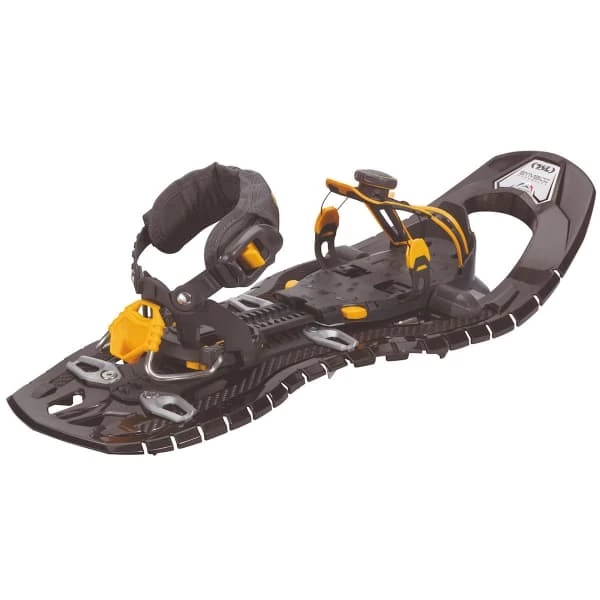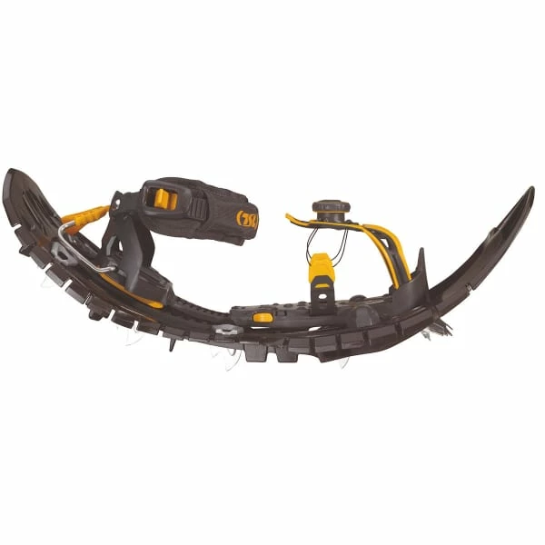 Bénéficiant de la technologie Hyperflex pour un déroulé du pied totalement naturel, cette raquette possède une forme en taille de guêpe qui permet une démarche naturelle. Légère et accrocheuse, elle ajoute une griffe avant, des lames verticales et différents crampons en acier inoxydable qui permettent un contrôle optimal et accrocheur de chaque pas sur tous types de neige. D’autre part, des renforts en carbone stockent l’énergie lors de la flexion et la restituent en fin de foulée, ce qui augmente la puissance de marche et limite les efforts. Limitant aussi les vibrations, ils améliorent la relaxation musculaire ainsi que la sensation de liberté et de facilité.